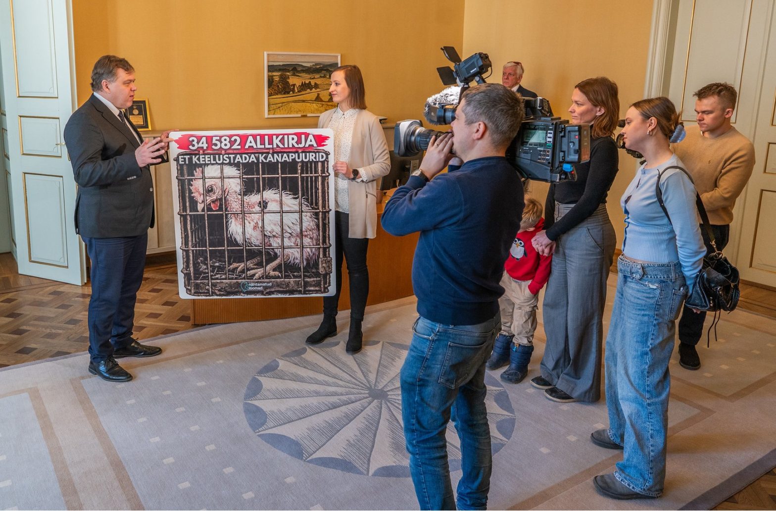 Täna hommikul andis loomade heaolu organisatsioon Nähtamatud Loomad Riigikogu esimehele Lauri Hussarile üle 34 582 allkirjaga rahvaalgatuse kanade puurispidamise keelustamiseks Eestis. Tegemist on suurima allkirjade arvuga rahvaalgatusega farmiloomade heaolu parandamiseks Eestis.