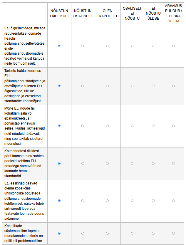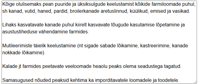 Vasta oma sõnadega, missugused on kõige suuremad farmiloomade heaoluprobleemid Sinu silmis. Too välja puuride kasutamisest loobumise kõikide farmides peetavate loomaliikide puhul ja samasuguste standardite kehtimise ka imporditud loomadele ja toodetele, kuid pane kirja ka muud muudatused, mida soovid näha.