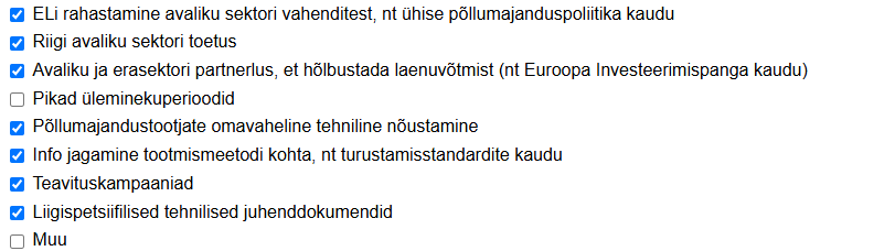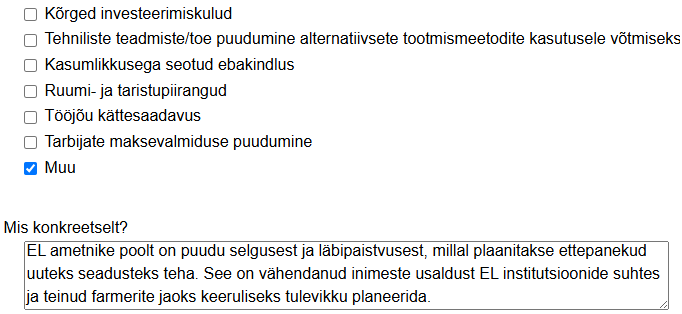 Teisi takistusi palun mitte valida, sest need takistused ei ole piisavaks põhjuseks kannatusi põhjustava puurispidamise jätkumiseks ja toimivad puurivabad tootmised on olemas, mis suudavad turgu varustada.