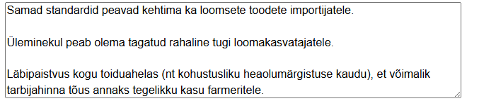 Vasta oma sõnadega – võid tuua enda sõnastuses välja samad punktid nagu ülal kastis või mõelda, kuidas kõrgem loomade heaolu on ka loomakasvatajatele kasumlik (nt tervemad loomad, usaldusväärsus, nõudlus) ning mida Sinu arvates farmeritel on vaja, et loomade heaolu suurendades konkurentsis püsida (nt rahastus, koolitused, tugi üleminekuks kõrgemale heaolule). Sa ei pea olema ekspert, jaga lihtsalt oma arvamust.