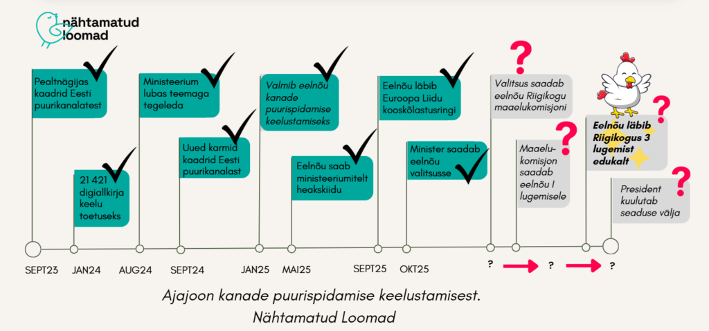 Hiljutise positiivseima arenguna jõudis eelnõu kanade puurispidamise keelustamiseks 8. oktoobril valitsusse.