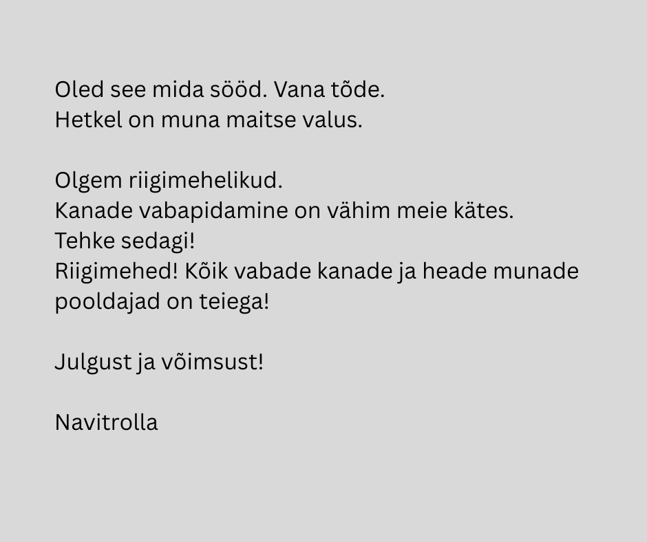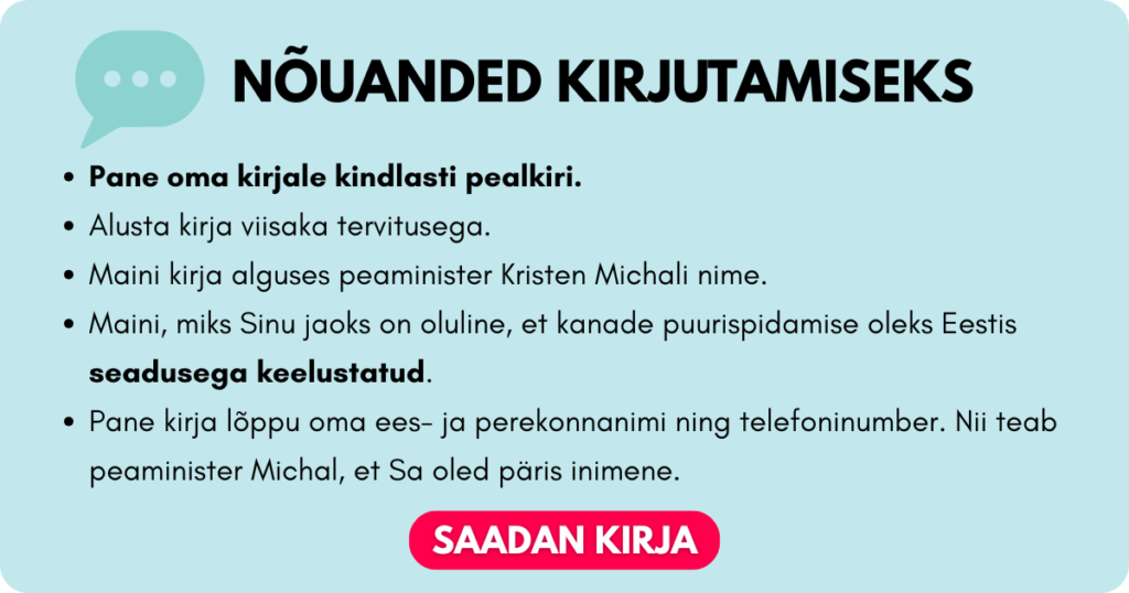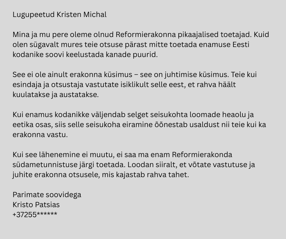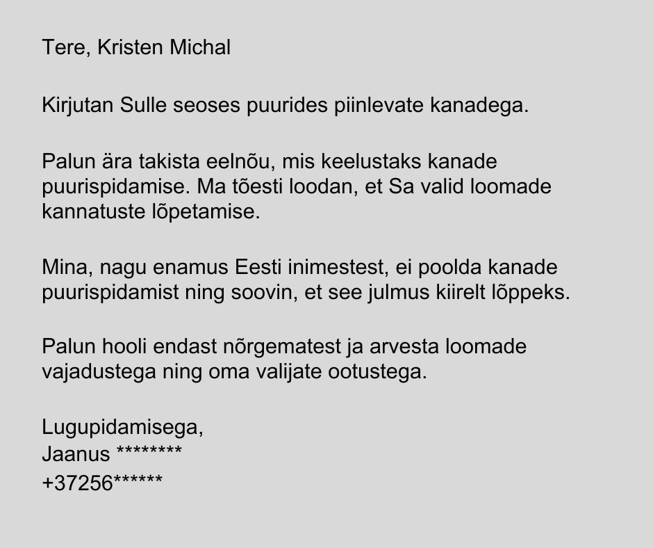 Kirjuta ka Sina ja anna Michalile teada, et Sina oled inimene, kes hoolib loomadest. Tee oma hääl kuuldavaks, et loomatööstuse huvid ei sõidaks üle 80% Eesti inimeste tahtest, kes soovivad kanapuuride keelustamist.
